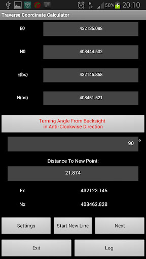- now you can either Exit program, or click Next to continue calculations. If you choose Next, program will shift (E,N) values from Point (0) to windows for Point (Backsight), and (Ex,Nx) values for just calculated Point(X) will be moved to windows for Point(0). Degree and Distance data will be cleared. Program ready for new Turning Angle and Distance values to next point along line.