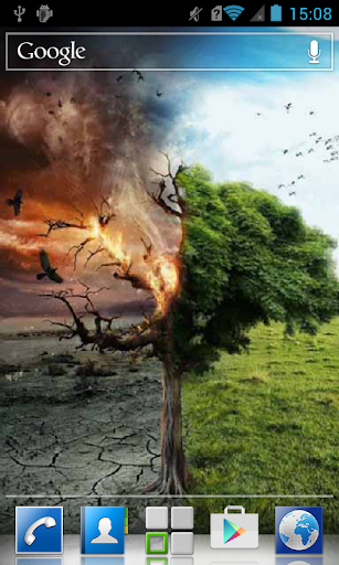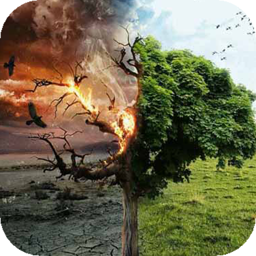Lone tree standing in the middle of open space. It is divided into two equal parts as well as the outside world. On the left side the dry earth is covered with lots of cracks and the tree is burning. On the right side the earth is covered with green grass and tree is rustling with lush foliage. Magical nature!