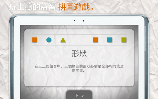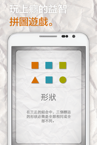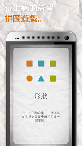 一個以視覺識別圖案技能的測試 - 三正。一個會上癮,適合所有年齡層玩家,刺激大腦訓練的益智拼圖遊戲。與時間競賽,根據形狀,顏色,填充和數量,組合一組三個的標誌。