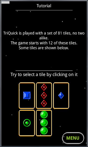 TriQuick is played with a set of 81 tiles, no two alike. The game starts with 12 of these tiles. Each tile has one to three identical shapes. These shapes may be rectangles, circles or diamonds; they may be colored red, green or blue, and they may be either solid, hollow or have a dot in a center. You play by finding groups of three tiles. When you select three tiles, they are removed and replaced with new tiles from the deck. You are searching for Troikas - three tiles that are either identical or different on each of four criteria: the number, shape, color, and shading of images on the tiles.