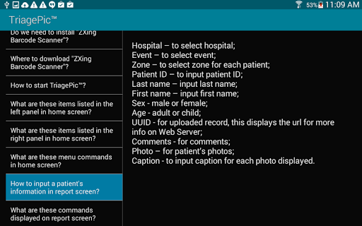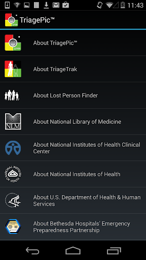 This is an Android version of the TriagePic® client software used by hospital staff to reunify friends and family during a mass disaster. TriagePic® is a reporting and tracking tool that allows staff to capture photos and brief information (name, age, gender, etc.) on disaster victims as they arrive at the hospital. This information on victims is stored in a database that may be searched by staff for family reunification purposes.