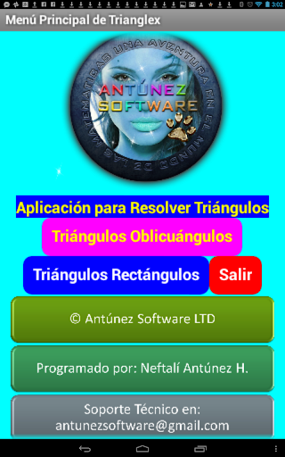Programa para Smartphones y Tablets que resuelve todos los casos y tipos de triángulos. Para los Triángulos Oblicuángulos: Caso 1: Conocidos sus tres lados. Caso 2: Conocidos Dos lados y un ángulo. Caso 3: Se conocen Dos ángulos y un lado. Para los triángulos rectángulos: Caso 1: conocidos dos lados calcula el tercer lado desconocido dejado en blanco, también calcula los ángulos A y B en gms. Caso 2: Conocido un ángulo y un lado, permite encontrar el otro ángulo y los otros dos lados desconocidos. Fue diseñada para Smartphones, pero funciona perfectamente en Tablets. Habla todos los resultados.