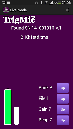 Drum Trigger Management Software. This is free service application for wireless control and management the TrigMic(TM) Gen2 devices. This application allows to upload the sounds to the TrigMic(TM) Gen2 device and also to adjust thin settings of this. The smartphone or the tablet must have a Bluetooth peripherals onboard.