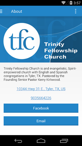 Experience Trinity Fellowship Church anytime, anywhere on your iPhone, Android or iPad! This state-of-art app was designed with you in mind. This easy-to-use app is free and provides you with unlimited access to: Sermons - You can watch or listen to TFC sermons. Events - See what events are coming, add them to your calendar, set reminders. Live Streaming - Experience our services live from anywhere in the world. Blogs - Get fresh insight from messages from our pastors. Give Tithes and Offerings in a completely secure way in just a few clicks directly from your mobile device. Trinity Fellowship Church is an evangelistic, Spirit-empowered church with English and Spanish congregations in Tyler, Texas. Pastored by Founding Senior Pastor Kerry Kirkwood.