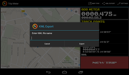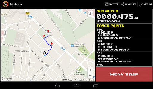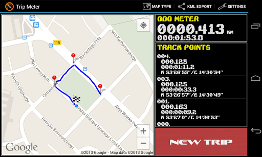 Cała trasa jest rejestrowana, a następnie może być wyeksportowana do pliku KLM lub przeglądnięta na mapie.