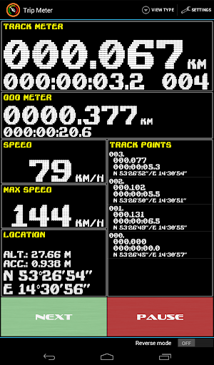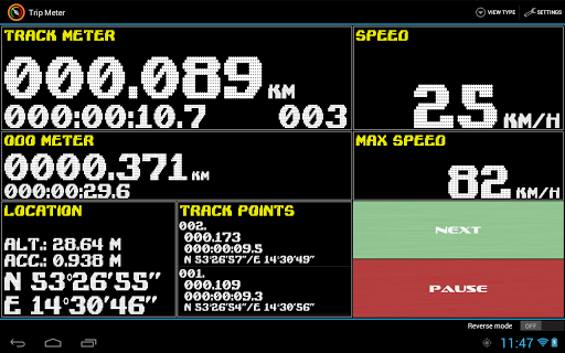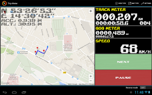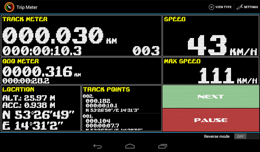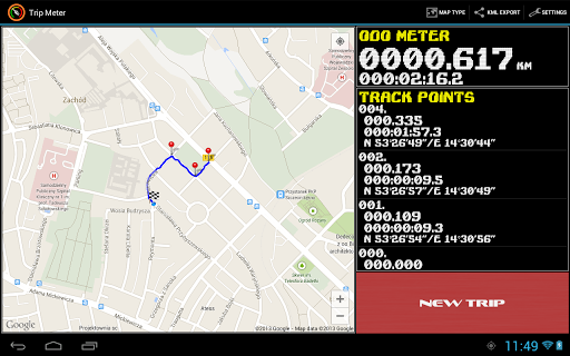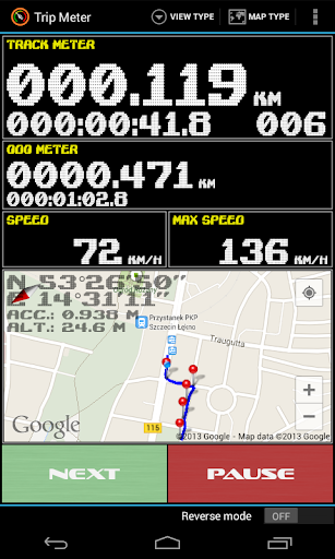 - widok mapy (mapa z narysowaną aktualnie przebytą trasą na bieżąco aktualizowana, czas i długość odcinka, czas i długość trasy, aktualna prędkość)