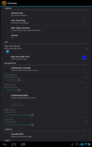 - widok przechyłomierza (przychyłomierz, czas i długość odcinka, czas i długość trasy, aktualna prędkość)