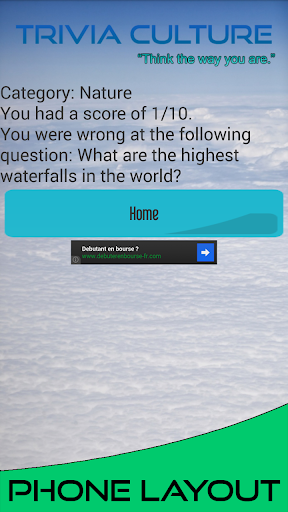 Trivia Culture is a multi quiz system where you get a list of categories with objects from life. Example: nature, anatomy, informatics. These categories gets updated at the same time with the application and it can have more categories on the future. If you get a question wrong you'll be redirected to final screen where you get the category, the score and the question where you answered wrong. At the moment the application is available only in english.
