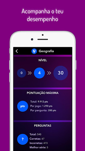 O Quiz TRIVIAL mostra um conjunto de estatísticas para que fiques à par do teu desempenho no jogo e tentes sempre melhorar os teus máximos!