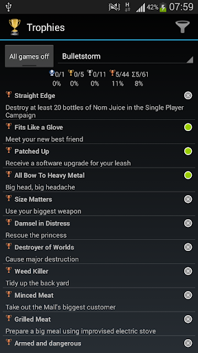 Trophy Hunter is an Android database app that you can use to keep track on your Playsation (PS3, PS4, PS Vita) trophies and Steam achievements. You can download all available trophies / achievements for specific games and check, which one you could go for.