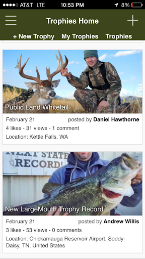 Join our Fishing and Hunting Social Media Site. Share your photos right from the field or lake, and create a Trophy Room to display your trophies. Interact with other anglers and hunters, find the hottest fishing spots in your area, win prizes, enter tournaments, and so much more!
