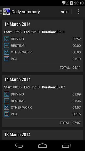 * Gives daily, weekly and fortnightly summaries of all driving activity, able to be offset to match your shift start time.