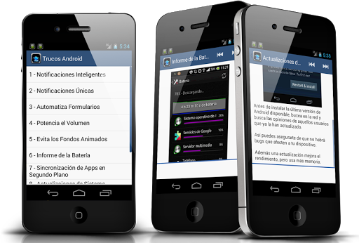 Aprende los mejores trucos android que te permitiran obtener el máximo rendimiento de tu dispositivo Android con esta aplicación. Y descubre el potencial que te ofrecen tu dispositivo, y tu sistema operativo. Con nuestras 10 guías descubrirás funciones que muy poca gente conoce y/o utiliza, y otras cosas que ni siquiera pensabas que eran posibles!