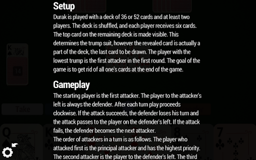 Durak is a prominent card game from Eastern Europe and Russia. If you don't know the rules, don't worry. True Fool has an interactive tutorial as well as in-game rules which you can access from the settings view. Do not blame me though if you cannot stop playing True Fool ;).