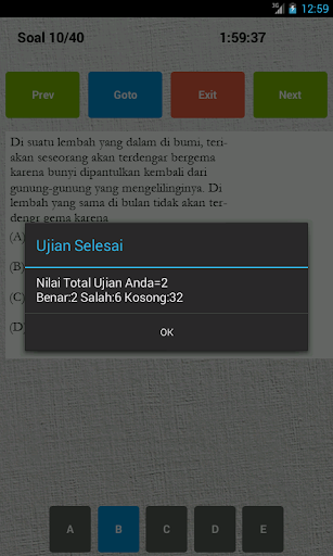 Aplikasi tryout dan latihan soal untuk pelajar SMP agar dapat lebih siap dalam menghadapi UN SMP Ujian Nasional Sekolah Menengah Pertama. Pengguna bisa memilih mode Tryout untuk mencoba mengerjakan kumpulan soal UN SMP dalam kurun waktu yang sudah ditentukan. Diakhir ujian akan ditampilkan hasil nilai yang dicapai dan dapat disimpan. Pengguna juga bisa memakai mode Belajar untuk dapat melihat contoh soal dan pembahasannya sesuai dengan topik mata pelajaran yang dipilih. Data soal akan terus kami update dan pengguna bisa mendownload soal yang baru melalui menu Bank Soal.