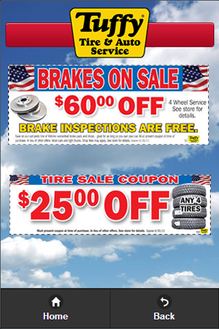 Get exclusive deals, make an appointment, get directions, and contact your local Tuffy Tire and Auto Service Center right from your Android Phone. This version of the app is meant for your mobile phone. While it will work fine on a tablet, the screen formatting was meant for a phone. For the Tablet edition, please see our other apps. http://www.tuffycf.com