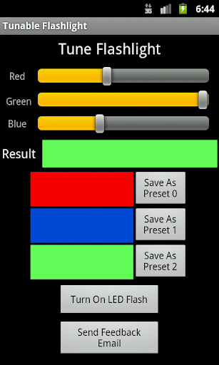 Tunable Flashlight is a simple app for displaying a solid color on the device screen. Solid colors can be customized using a three-slider RGB color value mixer, and three preset colors can be saved for later use. While displaying a solid color, a touchscreen slide-up/down gesture can be used to brighten or dim the solid color displaying. Tunable flashlight can also be used for turning on a camera flash LED for use as illumination.