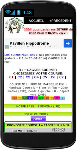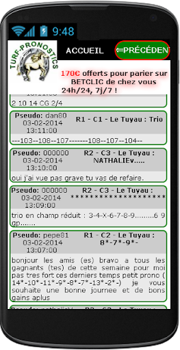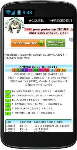 N'hésitez pas à télécharger notre application pour avoir accès à nos pronostics pmu et nos informations hippiques et surtout pour profiter des super tuyaux et pronostics gratuits des internautes pour vos paris sportifs dès maintenant...