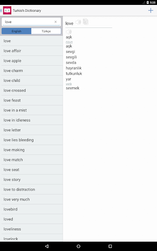 Bilingual dictionary translate words and phrases from English to Turkish and vice versa. Over 71,000 English and 93,000 Turkish words in an offline dictionary, with pronunciation. Includes word learning features and vocabulary training games.