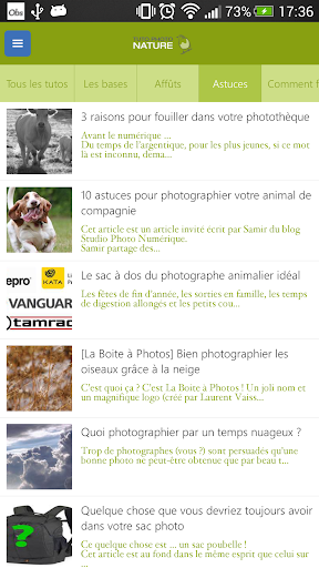 L'application TutoPhotoNature s'adresse à vous. Elle vous enseigne les principes de bases de ce domaine de la photographie. Vous serez guidés pas à pas pour améliorer votre pratique, mieux utiliser votre matériel et appliquer les trucs et astuces des meilleurs photographes nature et animaliers.