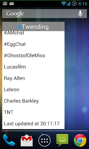 Homescreen widget that lists the top 10 trending topics in the US every 30 minutes. Click on a trend to see the most recent tweets. This widget will NOT wake your phone to update, so it won't drain your battery.