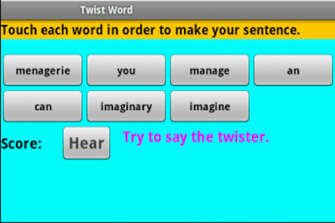 You will see the words of a tongue twister out of order. Tap each box that contains a word to put your tongue twister back in order.