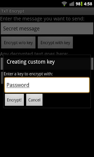 Now you can with this simple app! All you do is enter the message in the first text box and choose to encrypt it using the default key or with your own key. Then send it to the desired recipient through an email attachment or using Kik Messenger (Android only).