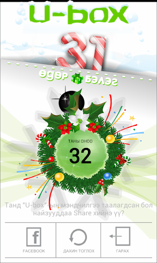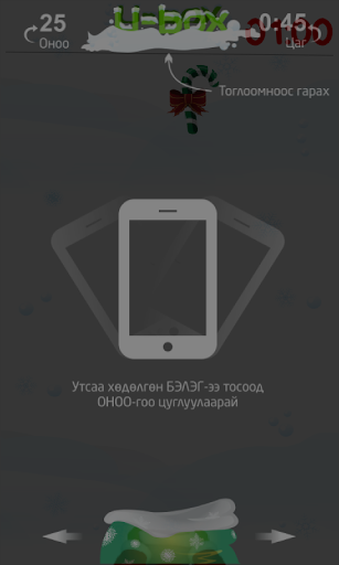 Мэндчилгээг уншуулсны дараа тоглох гэсэн товч гарч ирнэ. Та энэхүү товчийг дарснаар тоглоом эхлэх бөгөөд өвлийн өвгөний бэлгийн уутыг бэлгээр дүүргэх даалгавар танд ноогдоно. Хамгийн богино хугацаанд хамгийн өндөр оноо авсан хэрэглэгчид тусгай шагналтай бөгөөд та өөрийн FACEBOOK дээр онооны мэдээллээ постлосноор бид таныг тодруулах боломжтой болох юм.