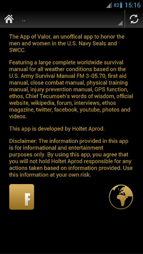 Featuring a large complete worldwide survival manual for all weather conditions based on the U.S. Army Survival Manual FM 3-05.70, first aid manual, close combat manual, physical training manual, injury prevention manual, GPS function, ethos, Chief Tecumseh's words of wisdom, official website, wikipedia, forum, interviews, ethos magazine, twitter, facebook, youtube, photos and videos.