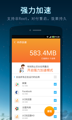 UC优化大师能有效防止后台应用重启,开启强力加速模式。通过特有的强制停止应用技术,让顽固重启的应用在停止之后效果持久,彻底释放你的内存。在非Root情况下,同样可以达到Root情况下的效果。