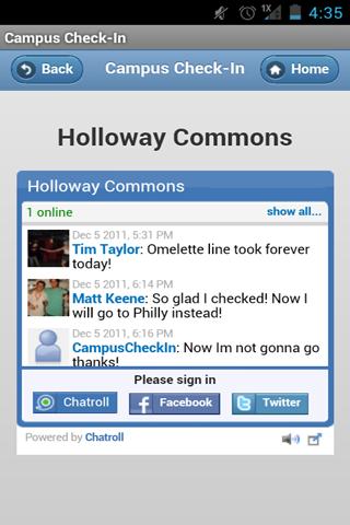 UNH Campus Check-In is an interactive application that allows users at a specific campus the ability to view live feeds of information as to what is going on at places they are going to. This helps prevent going to the dining hall just to find out there is no good food or walking across campus to the gym to find out it is too full to get your workout in!
