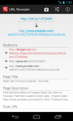 Easily accessible from Twitter and Facebook apps. Click on any shortened link in a tweet or a direct message to reveal the original link before opening it in the browser. Good practice to avoid opening malicious or ipspy links accidentally.