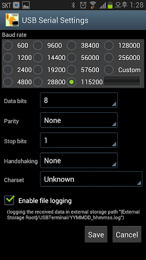 Select enable file logging for logging received data in the external storage path "[External Storage Root]/USBTerminal/RAW_YYMMDD_hhmmss.log".