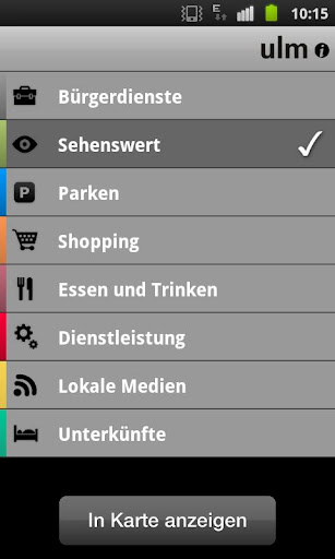 Das Modul “Sehenswertes“ bietet einen überblick über die vielfältigen Angebote in Ulm und um Ulm herum. Jeder Punkt von Interesse (POI) wird ebenfalls mit vielen Detailinformationen wahlweise als Listen- oder Kartenansicht angezeigt.