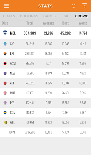 - Full club statistics for every A-League club, including Adelaide United, Brisbane Roar, Central Coast Mariners, Melbourne Heart, Melbourne Victory, Newcastle Jets, Perth Glory, Sydney FC, Western Sydney Wanderers and Wellington Phoenix.