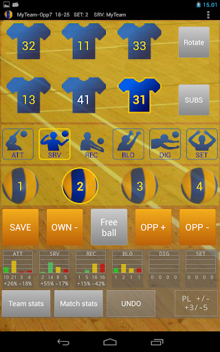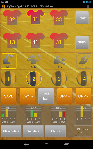 - record your team's attacks, serves, receives, blocks, digs and sets, and estimate them in levels 1...4