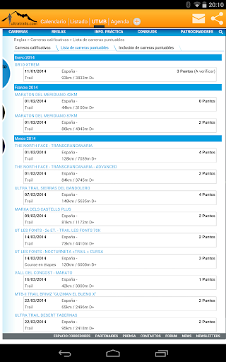Todas las carreras tienen enlace a la web y vienen indicados los kilómetros y el desnivel positivo.