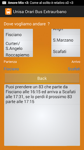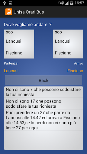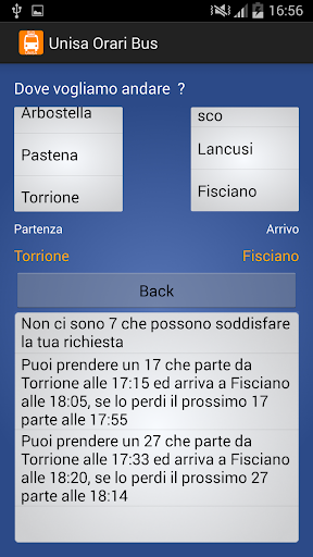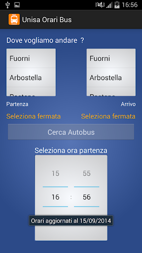 Sei all'Unisa e vuoi tornare a casa ? oppure sei a salerno e devi seguire ?vuoi evitare di aspettare una marea di tempo? vuoi sapere quando passa il prossimo bus ? semplice, seleziona partenza e destinazione , clicca sul tasto cerca e saprai subito quando passerà il prossimo bus. L'app cercherà fra le linee universitarie quale possono portarti a destinazione in base all'ora attuale. Gli orari sono costantemente aggiornati, attualmente al 15/09/2014, subito dopo il ridimensionamento, e ti può aiutare a individuare quale 7,17 o 27 passa per medicina. Unisa Orari Cstp, una volta installata non necessità di connessione internet, ricordati solo di aggiornare, quando proposto, l'app, per avere sempre gli ultimi orari .