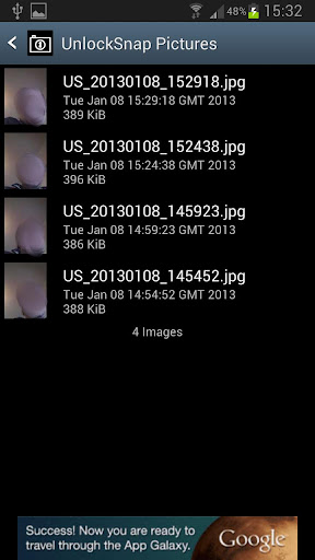 UnlockSnap takes a photo with your device's front-facing camera each time the device is unlocked. It allows you to see exactly who has been using your device in your absence. The application keeps the images hidden from the Android Media Scanner ensuring that none of them are visible in the Gallery application. You can temporarily disable photo taking and view the photos. In the full version you can also select the photo resolution, set the number of photos to keep and whether they are stored on external storage or on the device itself. UnlockSnap does not need a constantly running service so it does not significantly impact your device's battery life or performance; when Android tells it that the device has been unlocked it takes a photo and goes away.