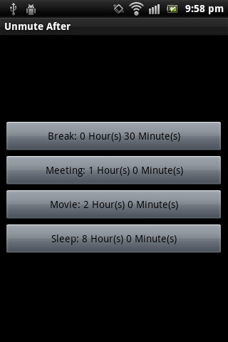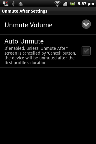 This is a simple app which will unmute your device automatically after a configured period of time. You can choose the duration after which your device should be unmuted.