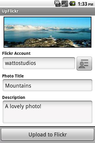 Quickly upload photos to Flickr from your mobile device. UpFlickr is integrated with your default Gallery app - no longer do you need a dedicated Flickr app, just upload your photos straight from the gallery.