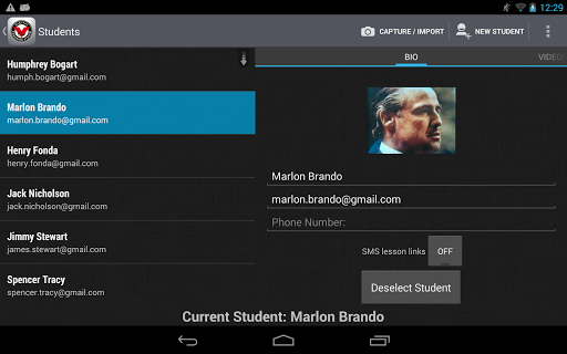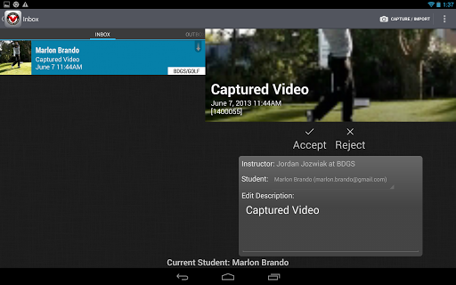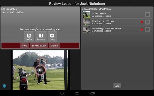 The V1 Pro app enables instructors with an active Branded Academy account the capability to perform real-time voiceover, telestrations and online lessons for their students right from their Android mobile device. Additionally, the V1 Pro app includes a student management function that allows for convenient importing from your Branded Academy and Android contact directory.