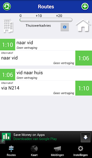 - -THUISWERKADVIES: Het thuiswerkadvies geeft op basis van je persoonlijke instellingen en de actuele verkeerssituatie op je huis-naar-werk-route aan of het verstandig is om (tijdelijk) thuis te werken en zo onnodige vertraging te voorkomen. De app stuurt je (indien gewenst) automatisch een pushbericht wanneer de vertraging is opgelost zodat je kunt kiezen om alsnog zonder vertraging naar je werk te gaan.