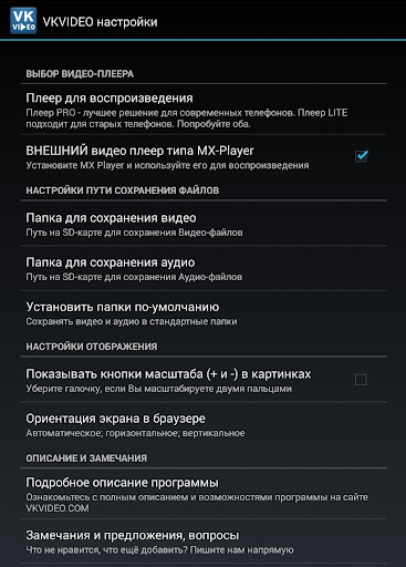 260 МИЛЛИОНОВ видео-клипов и аудио-треков Вы можете воспроизводить и сохранять на свой телефон или планшет с серверов ВК (ВКонтакте), Mail.ru (куча фильмов) YouTube, RuTube, 1TV.ru, Vevo, Vimeo, Ello и других в качестве 240, 360, 480 и 720. С помощью встроенного браузера Вы ходите по страницам сайта ВКонтакте, а с помощью встроенного плеера 6-го поколения проигрываете и мгновенно перематываете любые видео-файлы FLV MP4 и аудио-треки MP3 в ОНЛАЙН режиме!