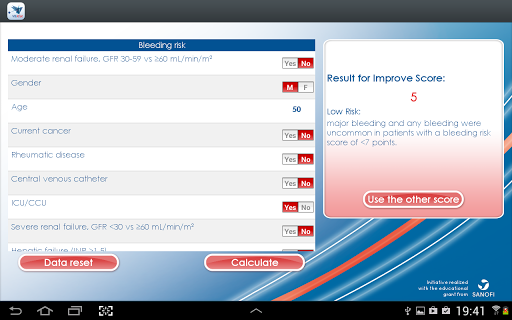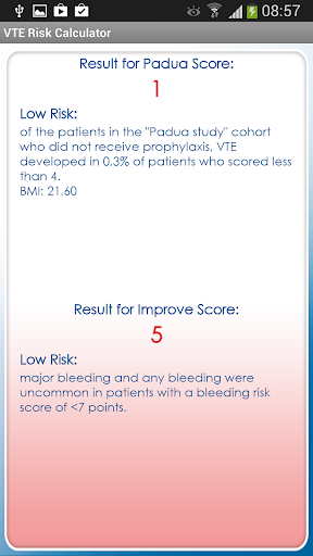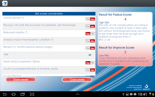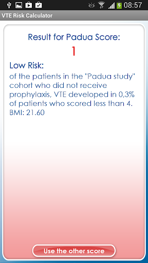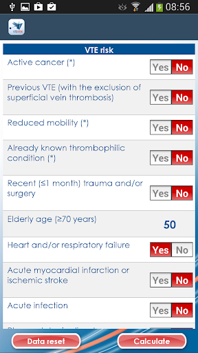 This application calculates some VTE (venous thromboembolism) risk scores as an “off line” calculator, anyway, it uses the internet access available via your device to give you access to the cited scientific articles (either as web pages as PDF files): we remind you that data exchange via the internet could lead to data traffic costs according to your carrier data plan; we suggest you to avoid using the data transferring while in roaming.