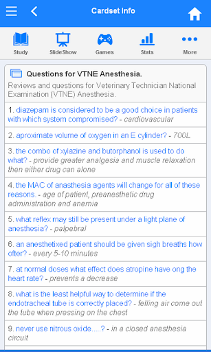 Using Flashcard will help you learn faster and remember more in a shorter time by showing flashcards just before you will forget them. VTNE Flashcards app has several learning modes: Study, Slide show, Matching, Memorize, Quiz to make the learning process for VTNE exam more exciting and fun.