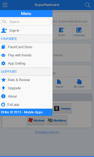 This app is also available on Apple App Store, Amazon Kindle App Store, Blackberry App Store and Windows Phone App Store. Please visit us at http://about.superflashcard.com/tour/ for more information .