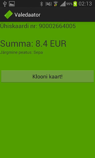 PS Valedeerimisega sõita ei saa. Info pärineb pilet.ee andmebaasist. Kaardi kloonimine on kahtlane tegevus ja seda ei ole soovitatav ega lubatud proovida, nupule vajutamine omal vastutusel! Peale nupu ekslikut vajutamist võtta koheselt ühendust rakenduse autoriga!