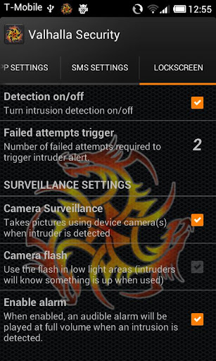 Valhalla Security is highly configurable and we want to make sure the user has complete control over how the app behaves. Settings are easily accessible from within the app and you should have everything set up the way you like it in a matter of minutes. All the remote commands are easily accessible via the device control panel located at https://valhalla.scheffsblend.com/ and most can also be used via encoded SMS text messages.