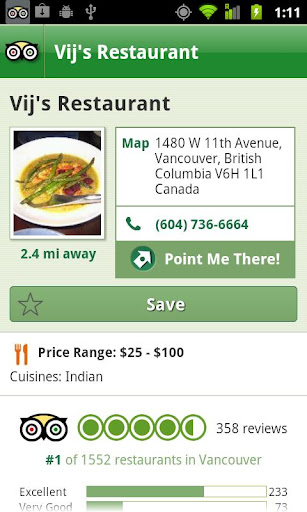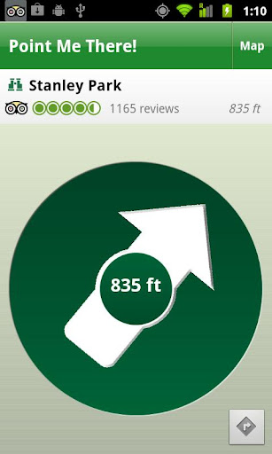 Once you have selected a restaurant or attraction, this app will guide you there using the fun & useful “Point Me There” screen, which uses the phone’s GPS and Compass.